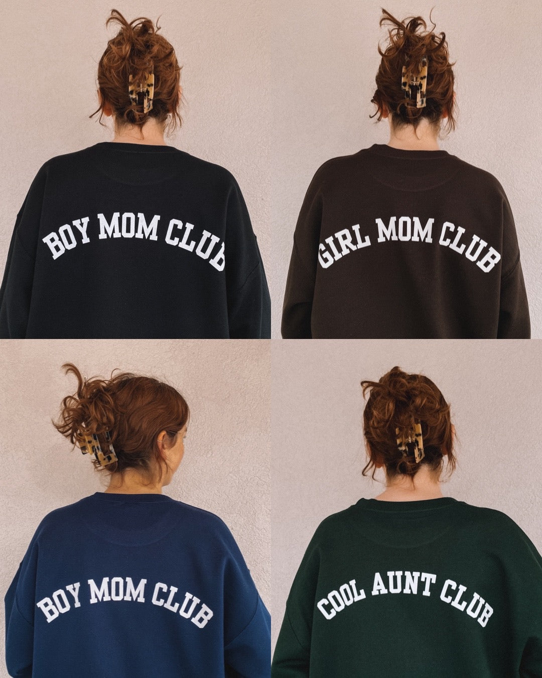 - size L on claire: boy mom club (navy + black), girl mom club (brown), fun mom club (light blue), cool aunt club (indigo + forest green)